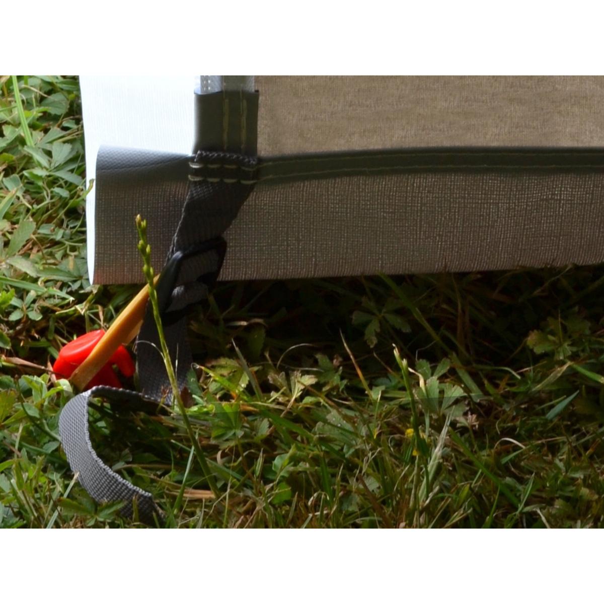 suspendre l'entoilage sur le hayon à l'aide des boutons pression Tenax qui s'adaptent parfaitement à la configuration intérieure de chaque véhicule. tendre la toile en l'arriment au sol avec les piquets.